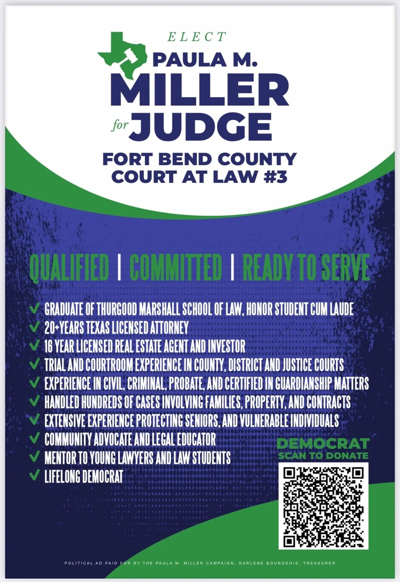Your donation helps us reach and educate more voters across Fort Bend County. Donate today. Political ad paid for by the Paula M. Miller Campaign, Darlene Bourgeois, Treasurer.